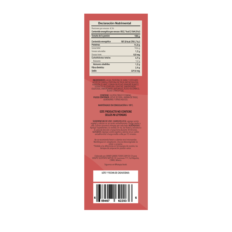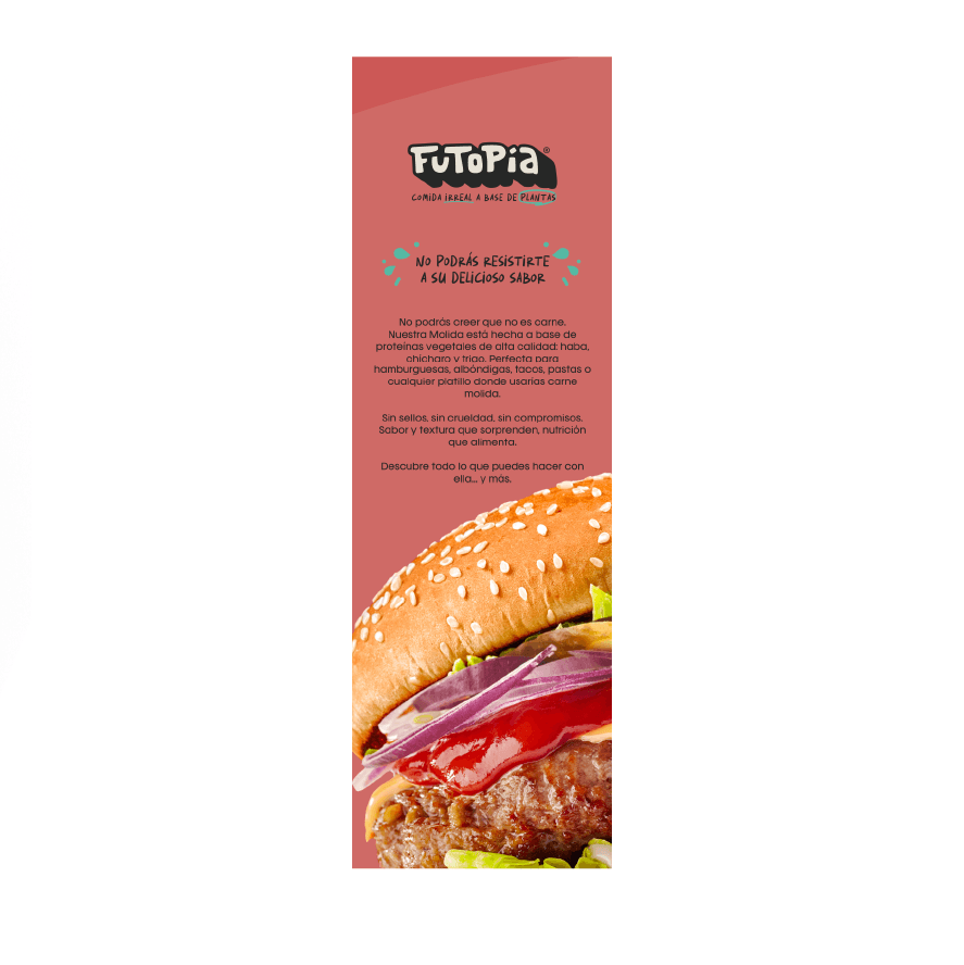 Futopia Molida Sin Carne es una deliciosa alternativa vegetal ideal para preparar tus platillos favoritos: tacos, pastas, albóndigas o hamburguesas. Elaborada con ingredientes 100 % de origen vegetal, ofrece una textura y sabor que imitan la carne tradicional, pero sin colesterol, sin colorantes y libre de lactosa.